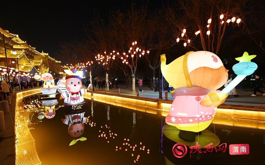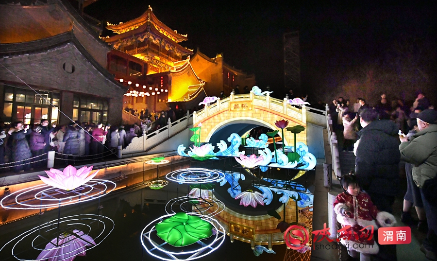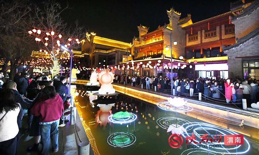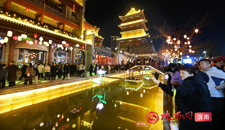 湭河水面上的莲花灯随波摇曳,望月楼与文昌阁在灯光映衬下,宛如穿越千年的长安盛景。记者 许艾学 摄