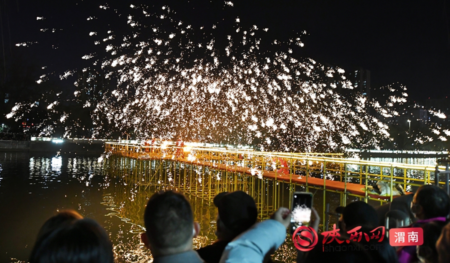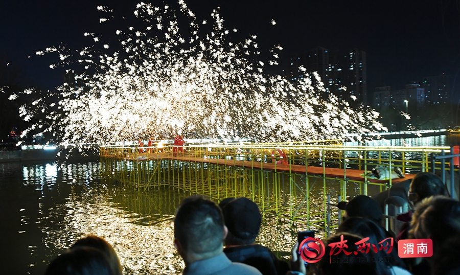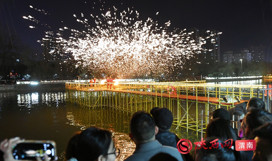 20:00 的河道打铁花更是重头戏,高温铁水凌空挥洒,化作漫天金雨,与岸边花灯交相辉映。记者 许艾学 摄