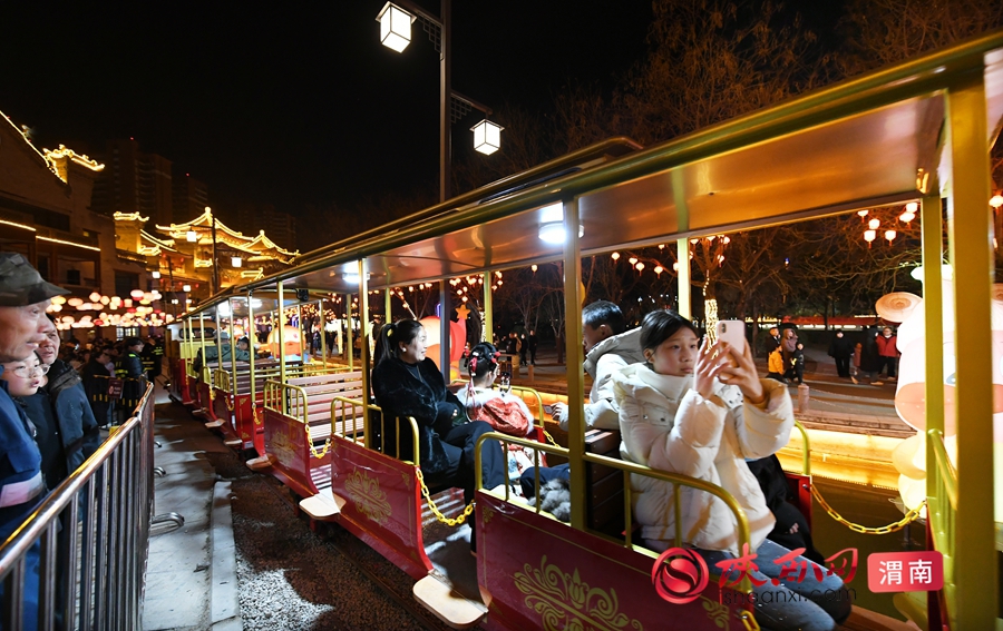 老街的烟火气不仅在美食与年货中,更在暖心的便民服务里。北侧停车场旁的儿童乐园,蹦床、充气城堡成为孩子们的欢乐天地;特色观光小火车全线开通,车身灯光与非遗元素相映成趣,载着游客轻松游览各个展区。市文化艺术中心邀请书法家现场题写春联、福字,剪纸传承人免费剪制窗花,笔墨飘香中,把新春祝福送到群众身边。夜幕降临,湭河东南小广场的露天电影准时开播,光影相伴间,年味愈发浓厚。